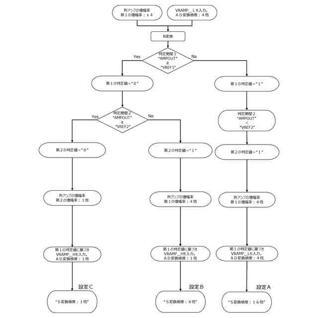 前記増幅画素信号と、前記ランプ信号にて生成したN-1個(N>1)の閾値電圧から選択されるいずれか1つの第2の閾値電圧値との比較によって第2の信号が生成され、前記増幅率切り替え回路は、前記第2の信号に応じた第2の判定値に基づき、前記増幅回路の前記増幅率を、N通りに切り替え可能であり、