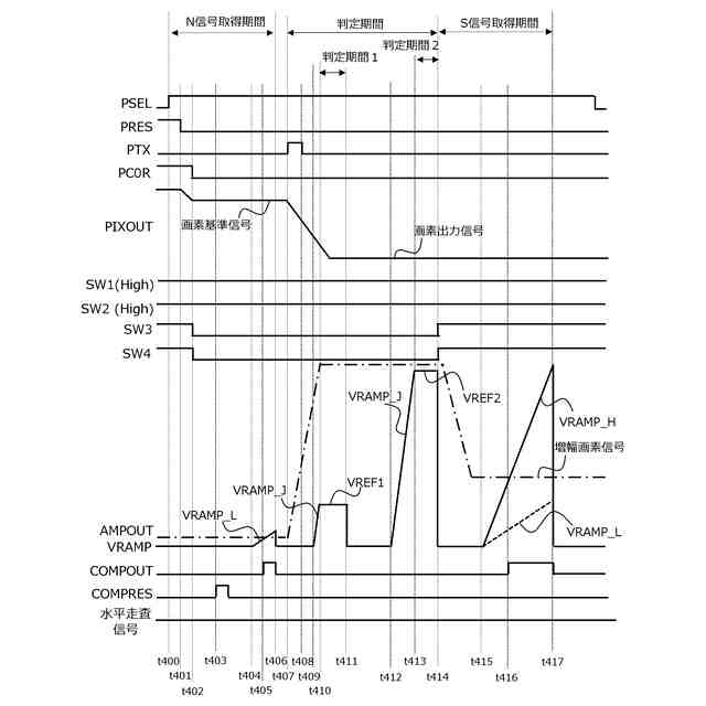 前記増幅画素信号と、M-1個(M>1)の閾値電圧から選択されるいずれか1つの第1の閾値電圧値との比較によって第1の信号が生成され、前記ランプ信号切り替え回路は、前記第1の信号に応じた第1の判定値に基づき、前記ランプ信号の前記電圧変化率を、M通りに切り替え可能であり、