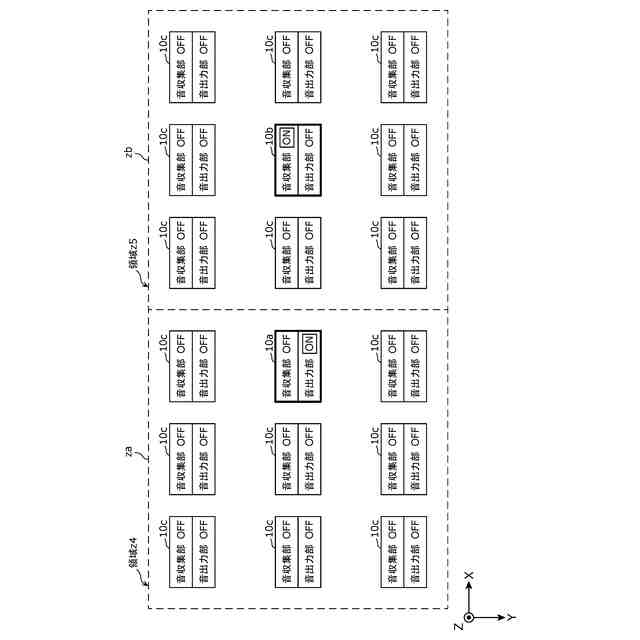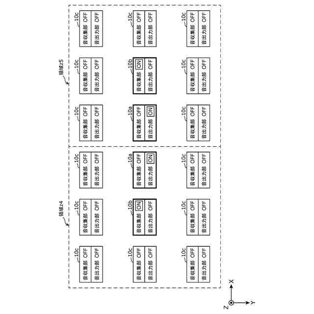 2つの領域における音収集部および音出力部の設定例を示す図である。