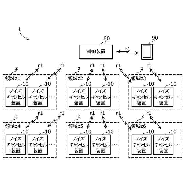 施設内の複数の領域に配置された複数のノイズキャンセル装置を示す図である。
