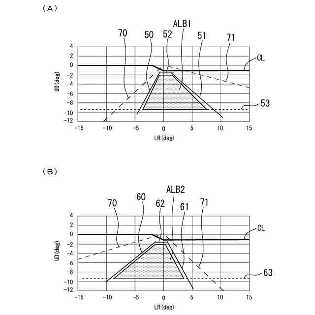 図3(A)、図3(B)は、第1実施形態における追加ロービームの照射可能範囲を説明するための図である。