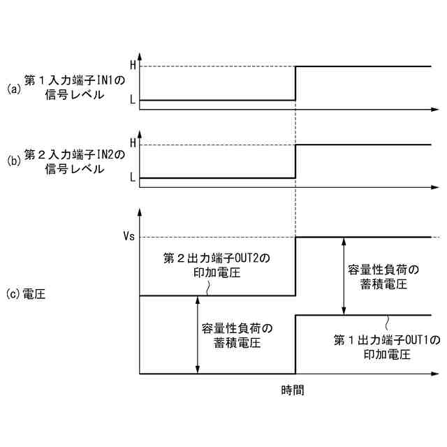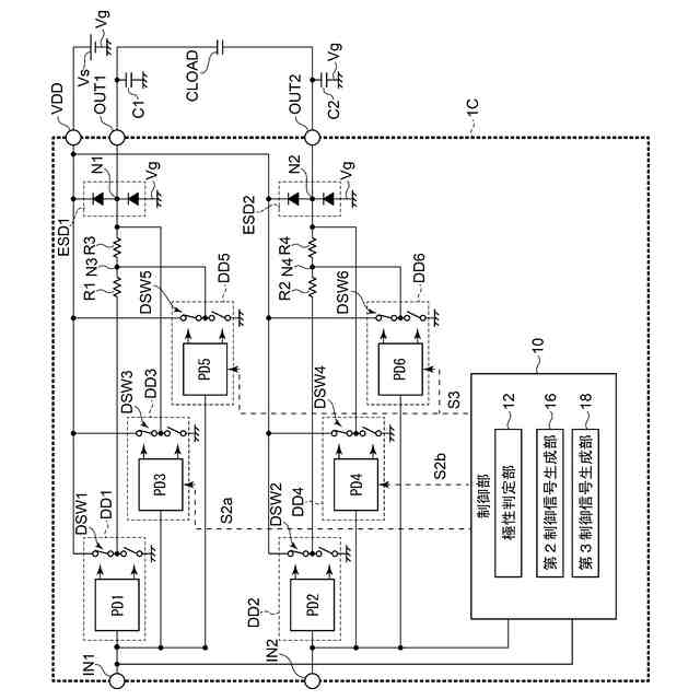 第2D級ドライバ回路DD2は、第2入力端子IN2に接続された第2ドライバ入力端子と、第2出力端子OUT2に接続された第2ドライバ出力端子と、第2ドライバ入力端子の信号レベルに応じて動作可能な第2プリドライバ回路PD2と、第2プリドライバ回路PD2によって接続状態を切替可能な第2ドライバスイッチング回路DSW2とを含む。第2プリドライバ回路PD2は、第2ドライバ入力端子に入力される信号レベルがHレベルの場合、第2出力端子OUT2を電源端子VDDに接続し、第2ドライバ入力端子に入力される信号レベルがLレベルの場合、第2出力端子OUT2を接地電位Vgに接続するように、第2ドライバスイッチング回路DSW2の切替操作を行う。