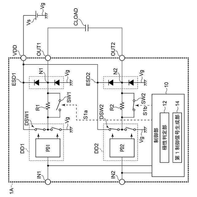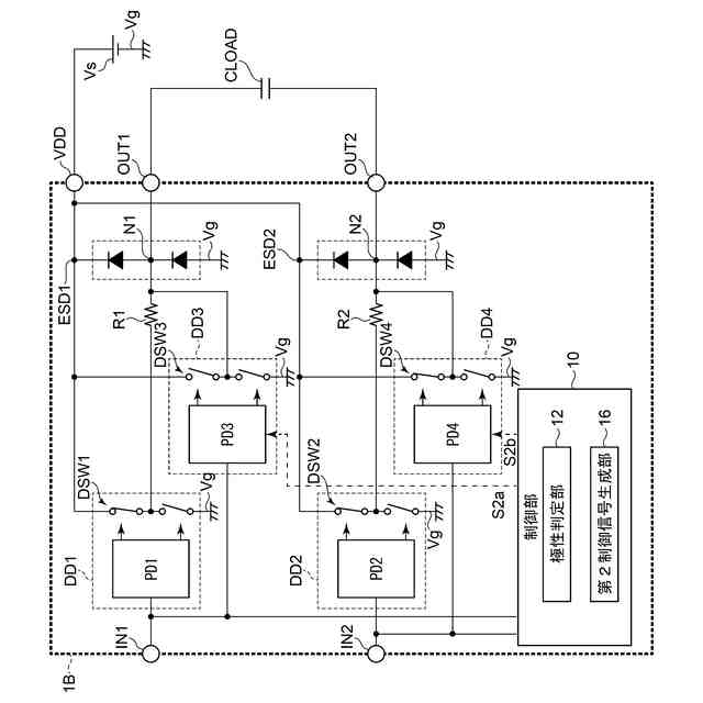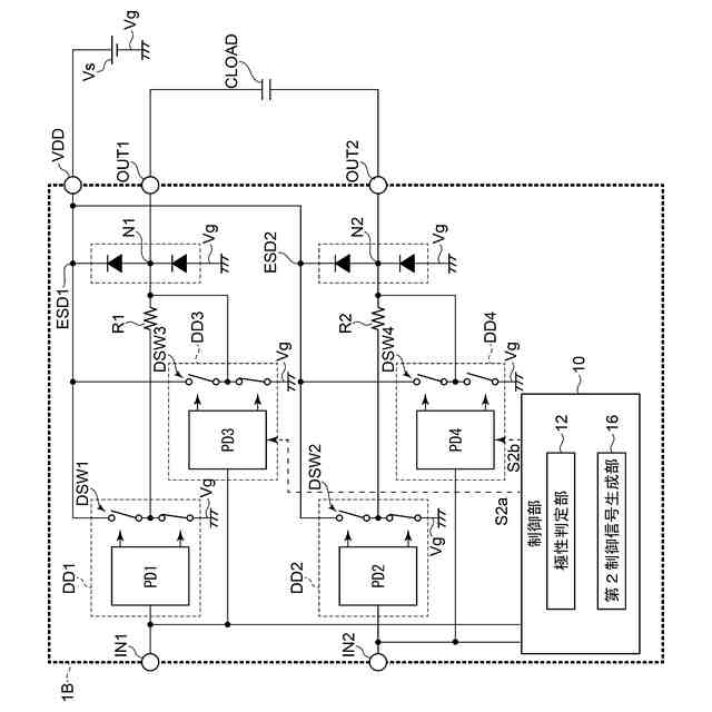 第1ドライバ出力端子と第1出力端子OUT1との間に設けられた第1ノードN1には、電源端子VDDと接地電位Vgとの間にわたってダイオードからなるESD保護素子ESD1が設けられる。また第2ドライバ出力端子と第2出力端子OUT2との間に設けられた第2ノードN2には、電源端子VDDと接地電位Vgとの間にわたってダイオードからなるESD保護素子ESD2が設けられる。