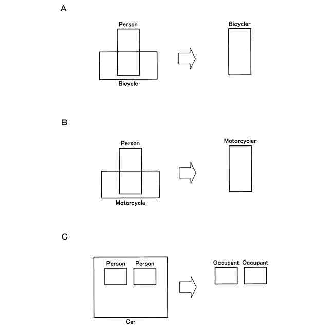 【解決手段】情報処理方法は、撮像画像を取得する処理と、前記撮像画像に映っている物体の少なくとも一部であって、乗り物を含む複数の物体に対し、該物体が存在する座標範囲を示す検出枠を設定する処理と、前記検出枠それぞれが示す物体の属性を特定する処理と、前記乗り物の検出枠と他の物体の検出枠とが重畳している場合、前記乗り物又は他の物体の属性に応じて前記他の物体又は乗り物の属性を変換する処理とをコンピュータが実行する。