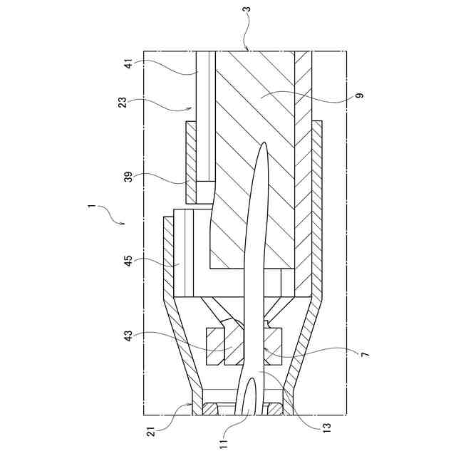 図1に示すように、本実施形態に係る電線固定構造1は、例えば、電源と機器、或いは機器と機器などの2つの電気部品(不図示)の間の情報通信を行う高速通信伝送用のコネクタ5に適用される。コネクタ5は、一方の電気部品に電気的に接続された電線3の端末部に設けられている。コネクタ5は、他方の電気部品に電気的に接続された相手コネクタ(不図示)と嵌合可能となっている。コネクタ5は、相手コネクタと嵌合することにより、相手コネクタと電気的に接続され、2つの電気部品の間の情報通信が可能となる。