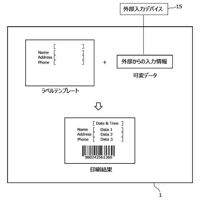 図1は、実施形態のラベルプリンタ1を利用したシステム構成の一例である。ラベルプリンタ1およびパーソナルコンピュータ(PC)10は、LAN(Local Area Network)11などのネットワークに接続している。LAN11は、さらに無線LANルーター12を接続している。スマートデバイス13は、無線LANルーター12を介して例えばWiFi(登録商標)でLAN11に無線接続している。パーソナルコンピュータ10とスマートデバイス13は、各々Webブラウザ14を利用可能である。外部入力デバイス15は、ラベルプリンタ1に有線又は無線で接続している。LAN(Local Area Network)11は、ファイアウォールなどを介して、さらにインターネットに接続してもよい。ラベルプリンタ1が利用するドライバやアプリは、インターネットを介してメーカーが提供するWebサイトからダウンロードできるようにしてよい。