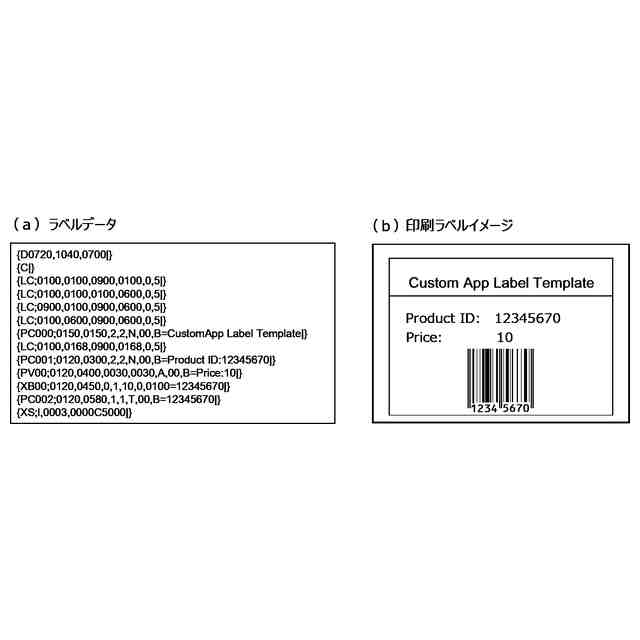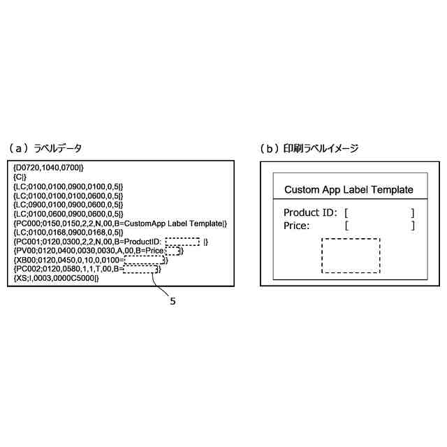 ラベルプリンタは、印刷機能を拡張することによって、スタンドアロン印刷機能を追加的に備えることができる。スタンドアロン印刷機能を備えるラベルプリンタは、プリンタ自身がバーコードリーダーなどの外部入力デバイスから情報を取得し、プリンタ内でラベルのテンプレートデータと合成して印刷することができる。印刷機能を拡張するには、ラベルプリンタのファームウエアとは別に、スタンドアロン印刷機能を実行するアプリケーションソフトウェアのパッケージをラベルプリンタにインストールする必要がある。以下、アプリケーションソフトウェアを単に「アプリ」と称する場合がある。