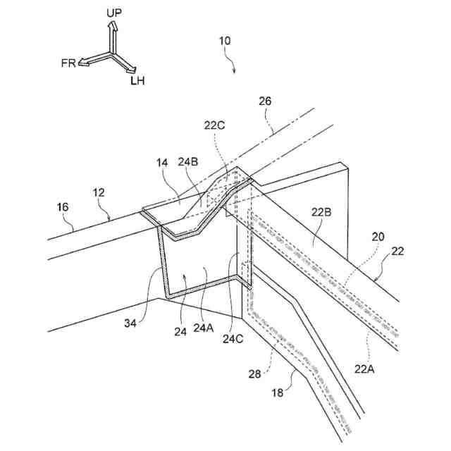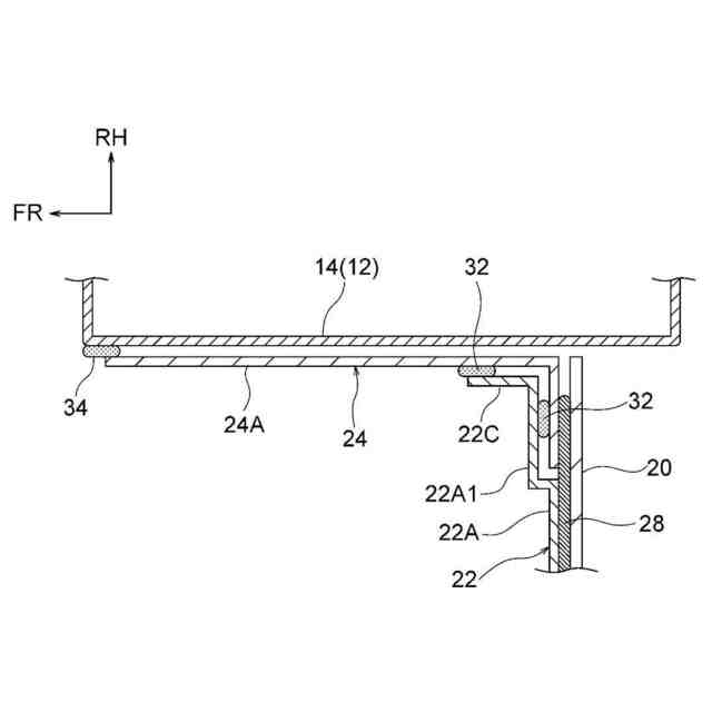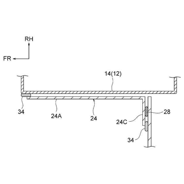 以下、図1~図5を参照して本発明の一実施形態に係る車両側部構造10について説明する。なお、各図に適宜記す矢印FR、矢印UP及び矢印RHは、車両側部構造10が適用された車両の前方向(進行方向)、上方向及び右方向をそれぞれ示している。以下、単に前後、左右、上下の方向を用いて説明する場合、車両前後方向の前後、車両左右方向の左右、車両上下方向の上下を示すものとする。