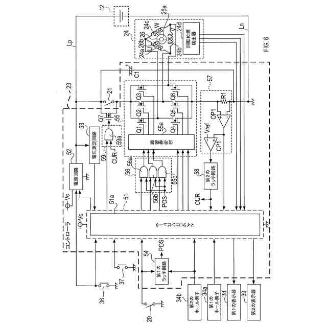 前記駆動回路は、(i)フルブリッジ回路の少なくとも一部を形成し、(ii)前記第1~第3のコイルに接続された第1~第6の半導体スイッチを備え、