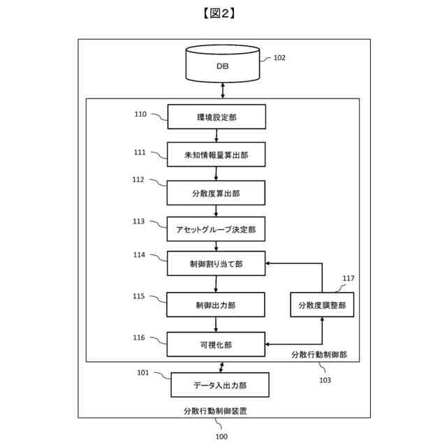 請求項2に記載の分散行動制御装置において、さらに、前記分散度を表示する可視化部と、前記分散度をユーザの操作に応じて調整する分散度調整部とを有し、前記アセットグループ決定部は、前記分散度調整部で調整された分散度に基づきサブアセットグループの数を決定し、前記未知情報量が多い領域でサブアセットグループを決定し、前記制御割り当て部は前記サブアセットグループに制御を割り当て、前記制御出力部は前記制御の割り当てを前記可視化部に出力し、前記分散度調整部は前記可視化部に表示される制御の割り当てを変更して前記分散度を調整することを特徴とする分散行動制御装置。