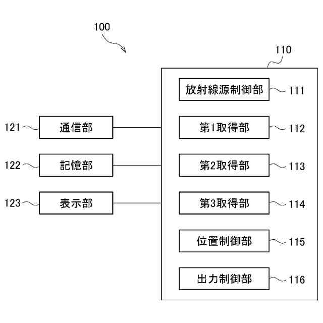 前記放射線源から前記検出器に向かう奥行き方向に第1距離離れた位置を第1位置とすると、当該第1位置から検出器の検出面に沿って第2距離離れた第2位置に対象物がある場合、前記検出器で撮像される前記対象物の像の前記検出器上の第3位置と、前記放射線源に対向する前記検出器上の第4位置との第3距離を取得する第1取得部と、