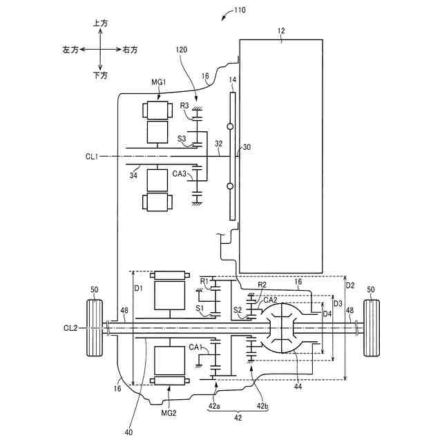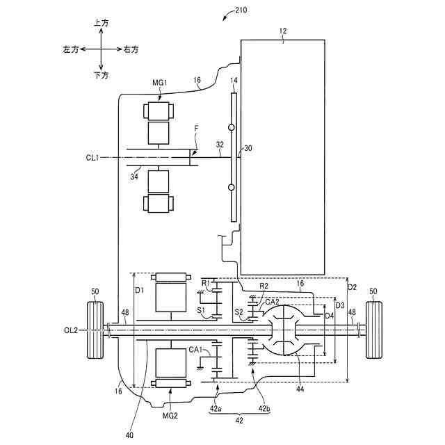 本発明によれば、(a)前記エンジン及び前記第1電動機が第1軸線周りにそれぞれ回転可能に配置され、(b)前記減速機構は、第1遊星歯車装置及び第2遊星歯車装置を含み、(c)前記第2電動機、前記第1遊星歯車装置、前記第2遊星歯車装置、及び前記ディファレンシャルギヤが前記第1軸線と平行な第2軸線周りにそれぞれ回転可能に配置され、(d)前記第2軸線方向において、前記第1電動機側から前記エンジン側に向かって順に、前記第2電動機、前記第1遊星歯車装置、前記第2遊星歯車装置、前記ディファレンシャルギヤが配置され、(e)前記第2電動機の出力軸が前記第1遊星歯車装置のサンギヤに連結され、前記第1遊星歯車装置のリングギヤが前記第2遊星歯車装置のサンギヤに連結され、且つ前記第2遊星歯車装置のキャリアが前記ディファレンシャルギヤに連結されている。上記(e)の構成により、第1遊星歯車装置及び第2遊星歯車装置を含む減速機構は、その減速比が大きくされつつ、第2軸線に対する外径の増大が抑制される。このように、減速機構の第2軸線に対する外径の増大が抑制されるとともに、上記(d)の配置により、第2軸線方向において第1電動機側からエンジン側に突出して配置される、第2軸線周りに回転可能に配置されたパワートレインの各装置の外径が小さくされやすい。これにより、第1軸線周りに回転可能に配置されたエンジンと、第1軸線と平行な第2軸線周りに回転可能に配置されたパワートレインの各装置と、が第1軸線と第2軸線との軸間距離の増大が抑制されつつ配置可能とされる。すなわち、エンジンとパワートレインの各装置との全体の体格が大きくなることが抑制される。