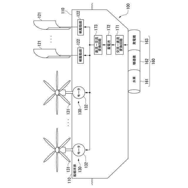 前記船舶は、海水の前記船舶に対する相対的な水流を用いて発電し、前記送風機に電気を供給する水流発電機を備える、