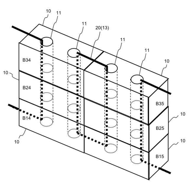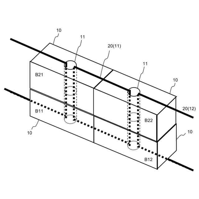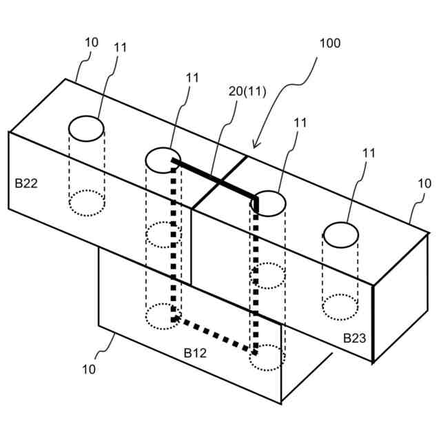 ブロックは、ブロックの積層方向となるブロックの上下面を貫通する貫通孔を少なくとも2つ有し、