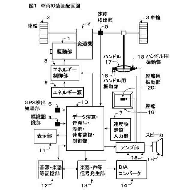 各種の音源が楽譜等に従って楽曲を車両内に出力するとともに、前記車両の速度を複数の段階の速度範囲で区切り、前記速度範囲の段階の増減に合わせて、前記楽曲等の前記楽譜上に繰返し生じる各小節の中の拍が占める時間を増減させ、前記拍が占める前記時間内にある音符に従った前記音源等の出力と同じ、又は類似する信号による振動を前記車両のハンドル、又は座席等に出力することを特徴とする速度計