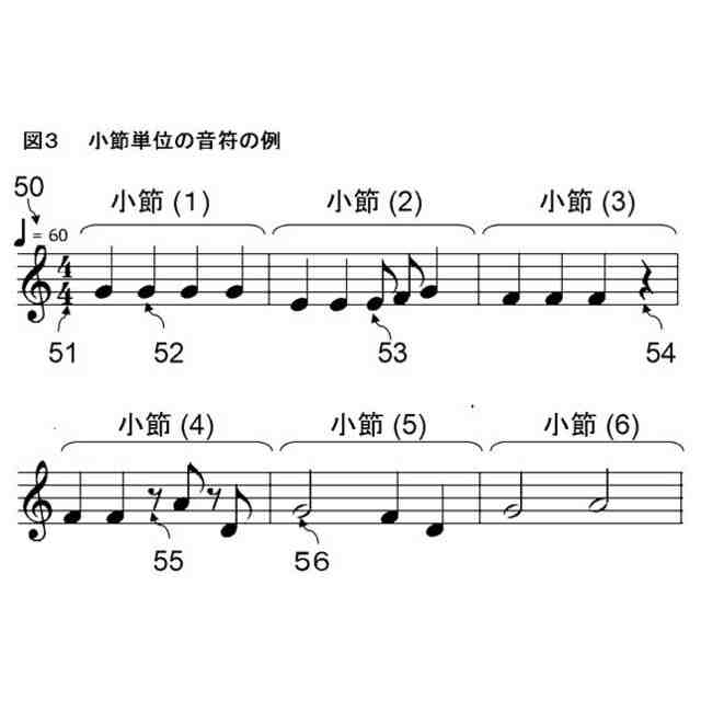 図3は、小節単位の音符の例 である。(実施例3)、(実施例4)