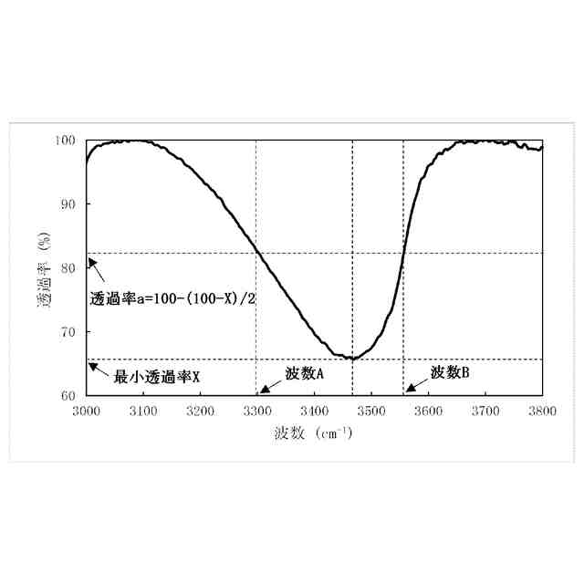 の範囲内におけるピークの最小透過率をX(%)としたとき、[100-(100-X)/2]を満たす透過率a(%)を示す波数のうち、低波数側の波数をA、高波数側の波数をBとした場合、前記A、B及び