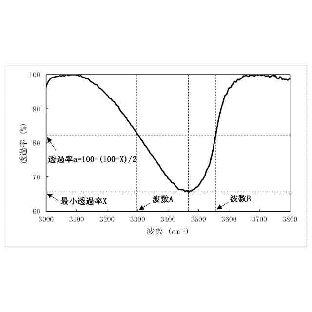 の範囲内におけるピークの最小透過率をX(%)としたとき、[100-(100-X)/2]を満たす透過率a(%)を示す波数のうち、低波数側の波数をA、高波数側の波数をBとした場合、前記A、B及び