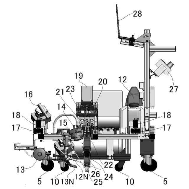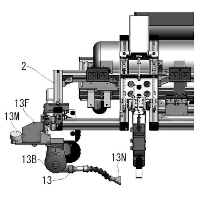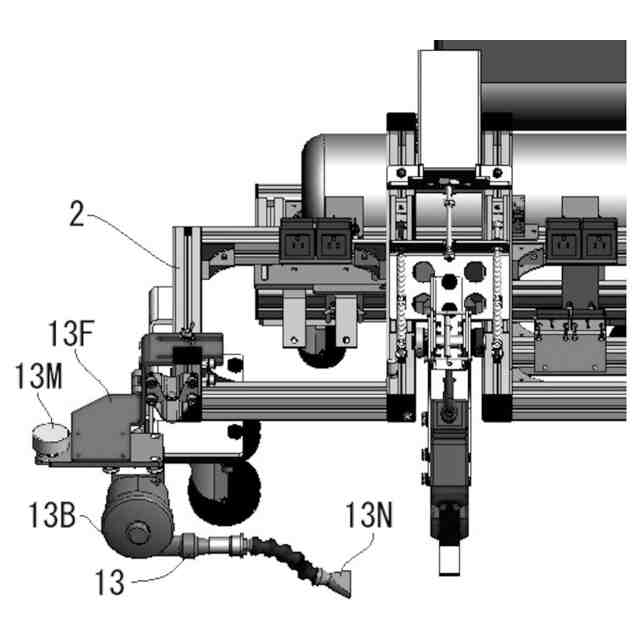 磁粉探傷の作業は、磁化器が備える電磁石の各磁極を被検体に接触させ、各磁極に通電して被検体を磁化した後、被検体表面に磁粉を含む検査液を散布し、磁粉が散布された箇所にブラックライトを照射し、被検体表面に現れる磁粉模様を検査員が観察することにより行われている。そして、この作業は検査員が磁化器、検査液散布器及びブラックライト等の検査機器を移動しながら作動させ、観察する作業の繰り返しとなるため重労働である。特に、被検体が備蓄タンクの隅部や平面部と側面部との接続部付近である場合には、隅部の溶接部や接続部付近の鋼板に存在する欠陥を検出するために、磁化器の一方の磁極を平面部に接触させ、他方の磁極を側面部に接触させて作業する必要があり、作業能率が悪く検査に時間がかかるという問題があった。