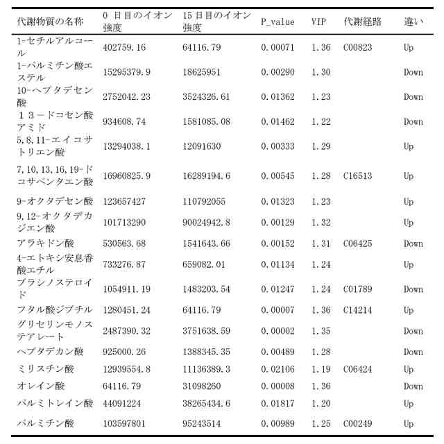 本発明のさらなる実施形態において、前記評価代謝マーカーは、1-セチルアルコール、1-モノパルミチン酸エステル、10-ヘプタデセン酸、13-ドコセン酸アミド、5,8,11-エイコサトリエン酸、7,10,13,16,19-ドコサペンタエン酸、9-オクタデセン酸、9,12-オクタデカジエン酸、アラキドン酸、4-エトキシ安息香酸エチル、ブラシノステロイド、フタル酸ジブチル、グリセリンモノステアレート、ヘプタデカン酸、ミリスチン酸、オレイン酸、パルミトレイン酸及びパルミチン酸を含む。
