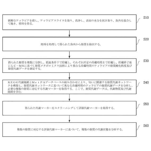 【解決手段】新鮮なティラピアを殺し、スライスを取り、洗浄し、魚肉を混合して挽くことにより原料を得るステップと、原料から脂質を抽出するステップと、得られた脂質を分割し、低温条件下で貯蔵し、貯蔵終了後に脂質メタボロミクス技術により異なる冷蔵時間のティラピアの脂質酸化程度及び脂質代謝データを測定するステップと、匂いに関連する脂質代謝ネットワークを構築し、脂質代謝ネットワークに基づいて異なる冷蔵時間の脂質の酸化程度及び代謝データを分析することにより、複数の脂質に対応する代謝マーカーが得られるステップと、得られた代謝マーカーをスクリーニングして評価代謝マーカーを得るステップと、複数の脂質に対応する評価代謝マーカーに基づいて複数の脂質の酸化程度及び代謝状況を分析するステップと、を含む。