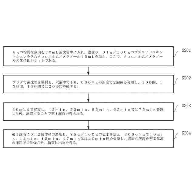 5gの均質な魚肉を50mL遠沈管中に入れ、濃度0.01g/100gのブチルヒドロキシトルエンを含むクロロホルム/メタノール15mLを加え、ここで、クロロホルム/メタノールの体積比が2:1であり、