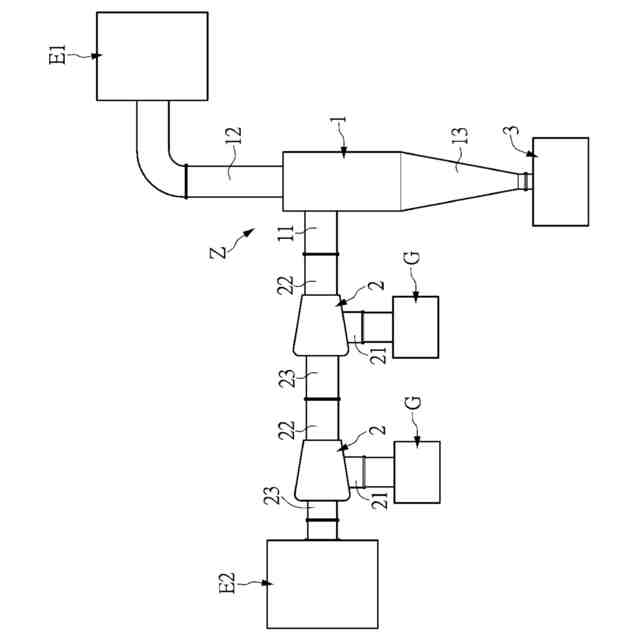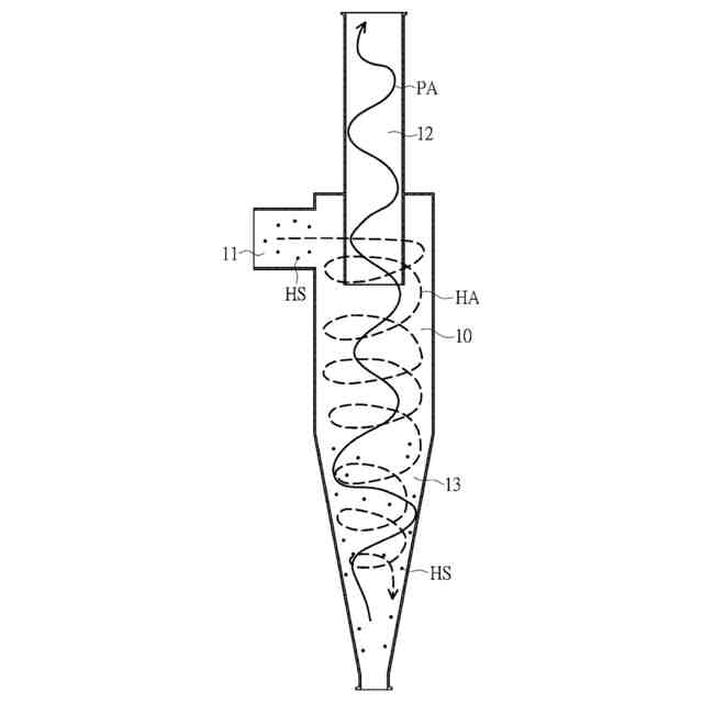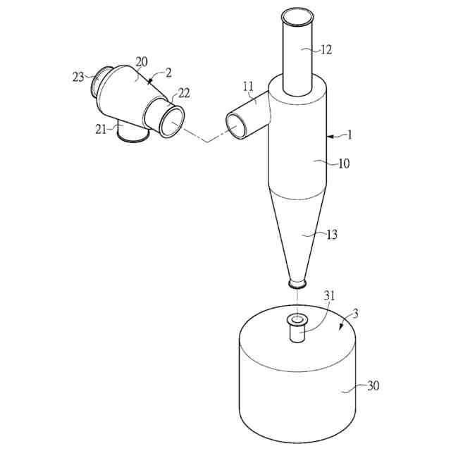 前記気流導入部が前記外部空気源装置から供給される駆動気流を受け取り、且つ前記第2のガス入力部が前記第2の外部装置から供給される有害気流を受け取ると、前記少なくとも1つの気流出力部品が前記駆動気流によって前記有害気流を前記第2のガス入力部に向かって流動させるように駆動され、前記第1のガス入力部が前記第2のガス入力部から供給される前記有害気流を受け取ると、前記第1のガス入力部が前記有害気流を前記少なくとも1つの粒子分離部品の本体内部に導入し、且つ前記有害気流を渦状に流動させるように駆動することにより、前記有害気流中の少なくとも1つの有害物質を前記有害気流から分離し、浄化気流を形成し、前記少なくとも1つの粒子分離部品が前記第1のガス入力部を介して前記浄化気流を前記第1の外部装置に送り、前記少なくとも1つの粒子分離部品が前記異物エクスポート部を介して前記有害気流から分離された前記少なくとも1つの有害物質を収集し、且つ前記少なくとも1つの有害物質を前記少なくとも1つの粒子捕集部品に送る、請求項1に記載の集塵装置。
