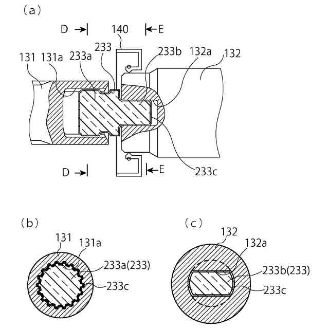 (5)前記ジョイントは、略短軸状の部材で、前記一端側に、断面が所定形状の第1の先端部を有するとともに、前記他端側に、断面が所定形状の第2の先端部を有し、前記ポンプ側回転軸は、前記他端側の端面から中心軸に沿って穿設され断面が前記第1の先端部に嵌合して軸回転を伝達する形状の第1の嵌合孔を有し、前記モータ側回転軸は、前記一端側の端面から中心軸に沿って穿設され断面が前記第2の先端部に嵌合して軸回転を伝達する形状の第2の嵌合孔を有し、前記回転軸は、前記第1の先端部が前記第1の嵌合孔に嵌合し、前記第2の先端部が前記第2の嵌合孔に嵌合することにより、形成されたものであってもよい。
