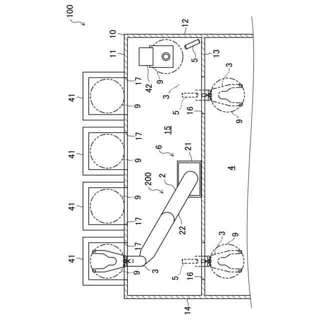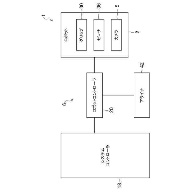 図1は、基板搬送システム1の平面図である。図2は、基板搬送システム1のブロック図である。基板搬送システム1は、基板9を搬送する。基板9は、半導体ウェハ又はガラス基板である。基板搬送システム1は、例えばEFEM(Equipment Front End Module)である。基板搬送システム1は、例えばソータ(Sorter)である。基板搬送システム1は、例えばストッカ(Stocker)である。ロボットシステム6は、基板搬送システム1に組み込まれる。