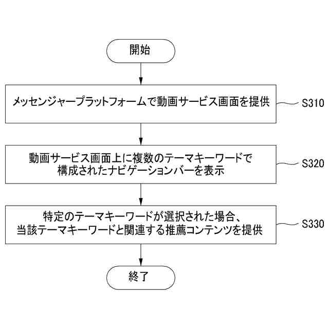 【解決手段】推薦コンテンツ提供方法は、メッセンジャープラットフォームで提供される機能の1つとして動画サービス画面を提供するステップ、およびテーマ(theme)単位の推薦コンテンツビューイング(viewing)のために複数のテーマキーワードで構成されたナビゲーションバー(navigation bar)を動画サービス画面上に表示するステップを含む。