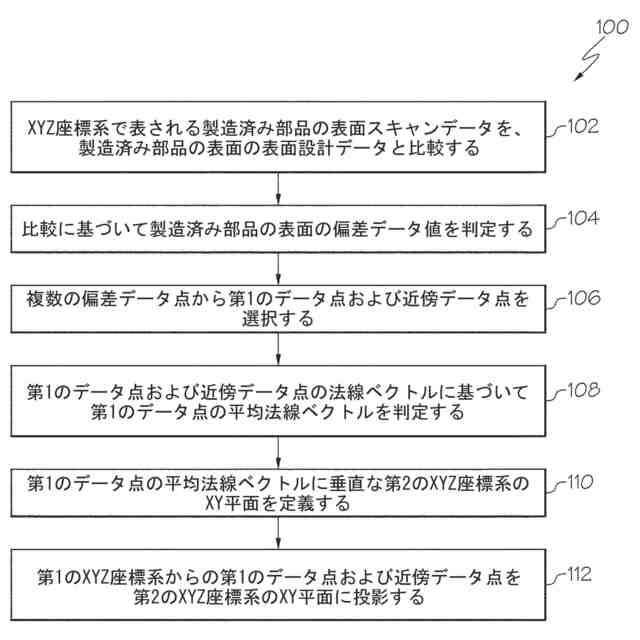 【解決手段】製造済み部品の表面の局所的差異を判定するための方法は、第1のXYZ座標系で表される製造済み部品の表面スキャンデータを製造済み部品の表面の表面設計データと比較するステップと、比較するステップに基づいて表面の偏差データ値を判定するステップであって、偏差データ値は偏差データ点として表される、ステップと、偏差データ点から第1のデータ点および近傍データ点を選択するステップと、第1のデータ点および近傍データ点の法線ベクトルに基づいて第1のデータ点の平均法線ベクトルを判定するステップと、第1のデータ点の平均法線ベクトルに垂直な第2のXYZ座標系のXY平面を定義するステップと、第1のXYZ座標系から第2のXYZ座標系のXY平面に第1のデータ点および近傍データ点を投影するステップと、を含む。