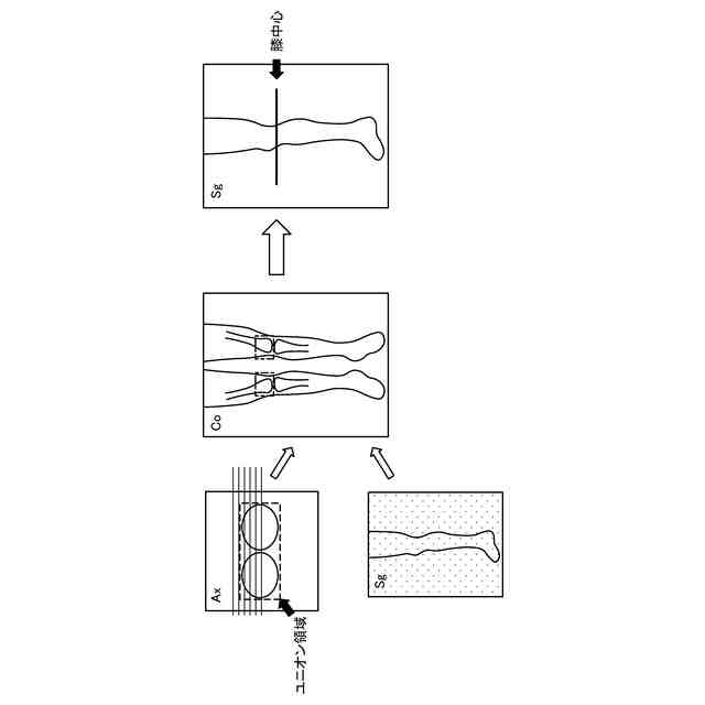 図9は、アキシャル面及びコロナル面の全身スライス画像スタックに基づいて膝中心の位置を特定する方法を示す模式図である。