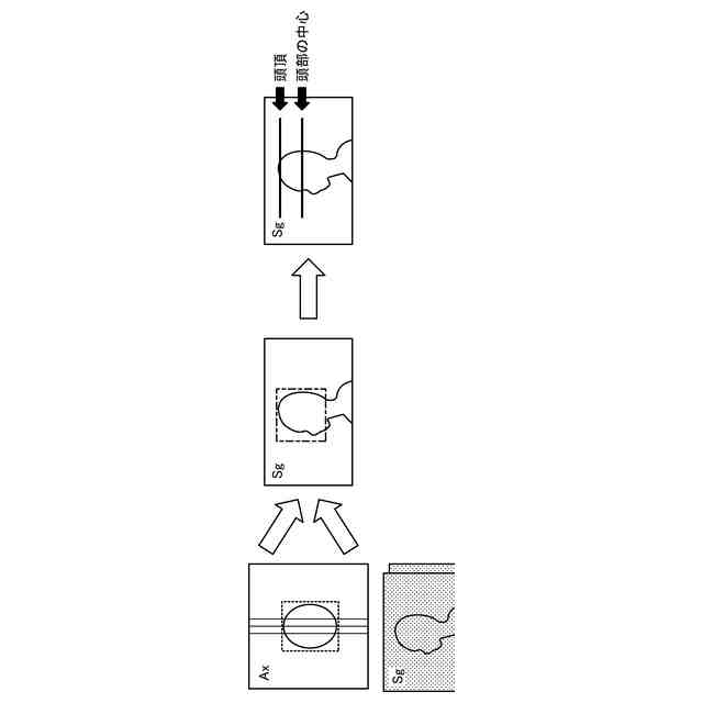 図8は、アキシャル面及びサジタル面の全身スライス画像スタックに基づいて頭頂及び頭部の中心の位置を特定する方法を示す模式図である。