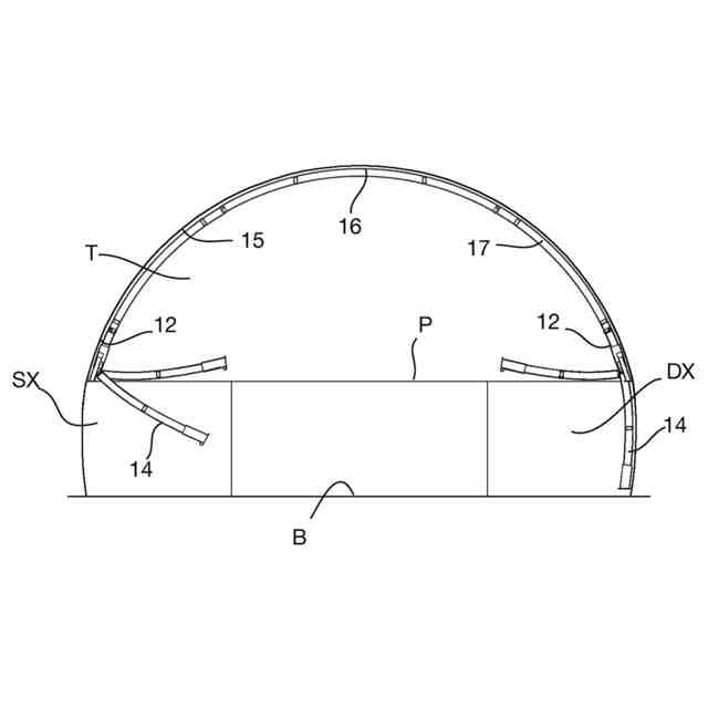 従来のリブを形成する構造要素は、フランジ付き継手によって接合されている。このシステムの開発および改良は、WO2015/186029に記載され、これには、リブを形成する構造要素を自動的に固定する関節式接続システムが記載されており、これは、リブ自体によって強化される掘削部の形状に概ね類似するアーチ型形状を有する。リブを形成する構造要素は、例えば、建築用鋼材などの金属材料で作られており、例えば、ヒンジによって回転可能な継手によって互いに接続されており、これは、構造ジョイント内に収容され、構造要素が実質的に互いに折り重なった第1の位置から、少なくとも1つの実質的に連続したリブ部分を形成するように配置される第2の位置へと移動可能になっている。