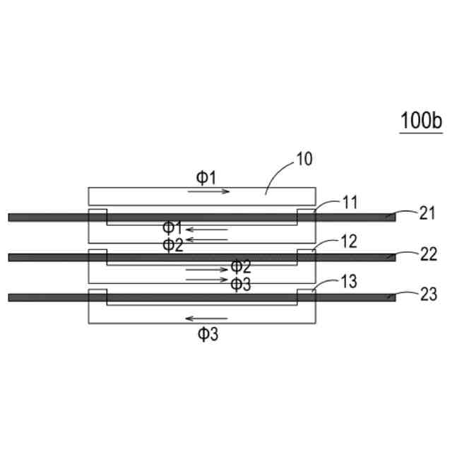 【解決手段】モジュラー積層型磁気部品100は、N相のDC-DCコンバータ用であり、Nは1より大きい奇数である。N相において、n番目の相は、(n+1)番目の相を360/N度先行し、nは、N未満の正の整数であり、N番目の相は、第1の相を360/N度先行する。例えば、モジュラー積層型磁気部品は、複数の磁気コア11、12、13、磁気カバー10及び複数の巻線21、22、23を含む。各磁気コアは、垂直に順に積層される。磁気カバーは、複数の磁気コアの上に積層される。複数の巻線は、それぞれDC-DCコンバータの各相に接続され、各巻線は、対応する磁気コアの巻線コラムに巻かれ、一体化されたトランスおよびインダクタを形成する。隣接する任意の2つの巻線は、電流方向が互いに反対である。