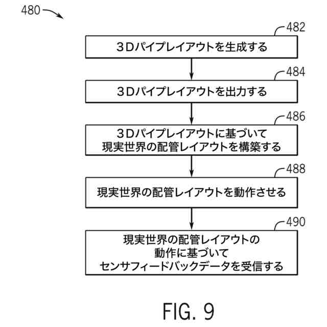 前記三次元パイプレイアウト(242)に基づいて建設された現実世界の配管レイアウトを動作させること(488)