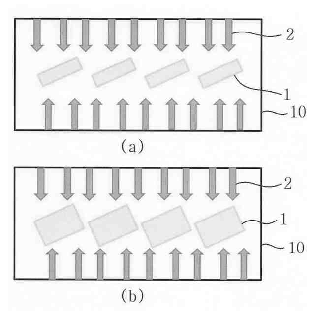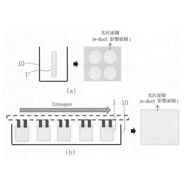 図1の(a)と(b)はそれぞれ従来の一般めっき装置と従来垂直連続めっき装置および各装置によるめっき後のイダクト影響面積(光沢面積)を示す模式図であり、(a)は一般めっき装置でめっき槽10内の基板1が把持された状態とめっき後基板1の光沢面積を示しており、(b)は垂直連続めっき装置でめっき槽10内の基板1が把持された状態とめっき後基板1の光沢面積を示している。これらの図に示すように、垂直連続めっき装置の場合、一般めっき装置の場合よりも基板1の全ての面積が影響を受けるため、めっきの光沢、均一な穴めっきで有利に作用する。
