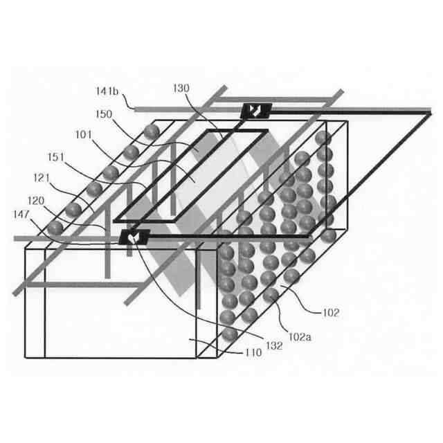 これに関して、本出願人によって開発された大韓民国登録特許第10-2539090号(発明の名称:めっき対象物の変位調節可能な垂直連続めっき装置、以下「特許文献1」と略称する)は、図3に示すように、めっき槽10内のめっき対象物である基板1を斜線方向に角度調節を可能に配置してめっき槽内のめっき対象物に対する作業量増大およびイダクト効果を最大化させ、製造収率増大および品質向上が期待でき、また、めっき対象物が前、後に移動し、少しずつ前進して全体の移動距離を延長することで、めっき槽のサイズ縮小およびそれに伴う複数のめっきラインの設置を可能にして多品種少量生産時に有利にした。