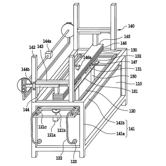 y軸移動台(145)の下部に結合されているが、第3モーター(146a)と第3カム(146b)およびx軸駆動シリンダー(146c)とを媒介体として結合され、y軸移動台(145)とともにめっき槽の前後方向(y軸方向)に沿って水平移動して第3モーター(146a)の回転運動による第3カム(146b)の直線運動およびx軸駆動シリンダー(146c)の往復運動によって連動してめっき槽の第2x軸(めっき槽の左右方向に向かって第1x軸と高さが異なるx軸)に沿って往復運動するx軸移動台(146)と、