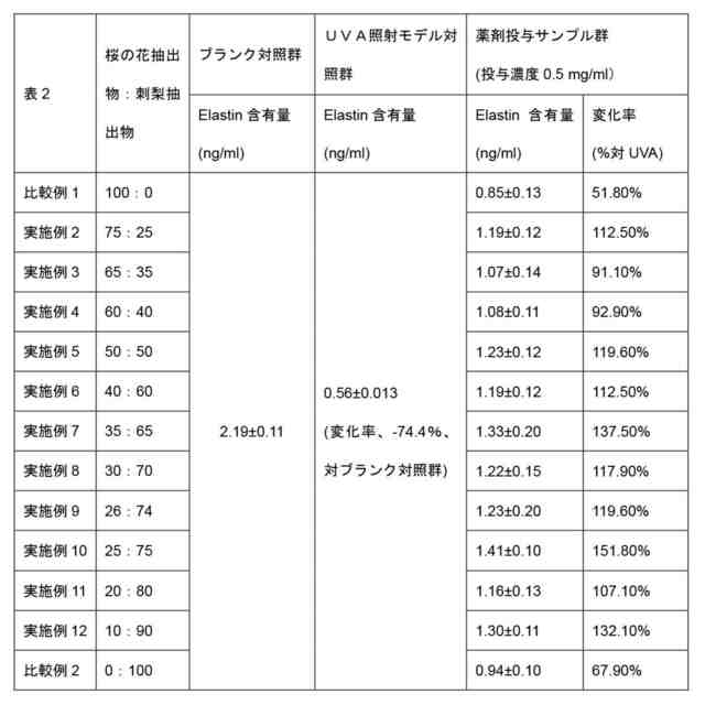 本発明者らは、研究を重ねたところ、桜の花抽出物および刺梨抽出物を併用した場合は、同等の投与量でいずれか一方を単独使用した場合よりも優れたコラーゲンおよびエラスチン産生促進効果が発現することを見出して、本発明を完成するに至った。