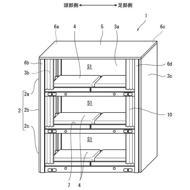 以下、図面を参照して実施形態を説明する。なお、以下の説明では、寝台内部に配置される寝具の頭部を配置する側から足部を配置する側にかけての方向を長手方向というものとする。また、寝台の積み重ねられた方向を上下方向というものとする。