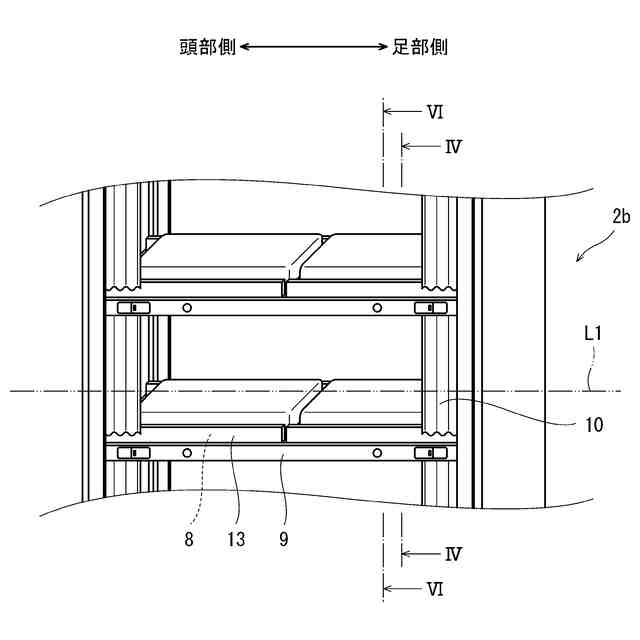 図1は、寝台セット1の斜視図である。本実施形態においては、寝台セット1は、3つの寝台2、つまり寝台2a、2b、2cが上下方向に重ねられて構成されている。図2に、3つの寝台2a、2b、2cのうちの1つの寝台2bについて拡大した斜視図を示す。