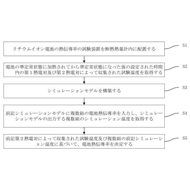 【解決手段】試験方法は、電池の準定常状態に加熱されてから準定常状態になった後の設定された時間間隔内の第1熱電対及び第2熱電対によって収集された試験温度を取得することと、シミュレーションモデルを構築することと、シミュレーションモデルに複数組の電池熱伝導率を入力し、シミュレーションモデルの出力する複数組のシミュレーション温度を取得することと、第2熱電対によって収集された試験温度及び複数組の前記シミュレーション温度に基づいて、電池熱伝導率を決定することとを含む。本発明は、熱伝導率の正確で、迅速で、安全な測定を実現することができる。