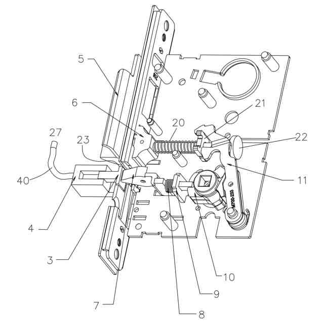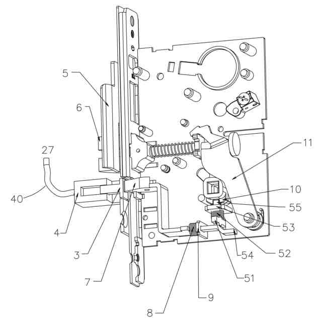 前記ロック舌機構は、ロック舌ばねと、ロック舌位置決め板と、ロック舌キャップとをさらに含み、前記ロック舌ばねは、前記ロック舌位置決め板と接触し、前記リンクストリップは、前記ロック舌の制御された移動のために、前記ロック舌位置決め板と前記ロック舌キャップとの間に位置する、ことを特徴とする請求項1に記載の装置。