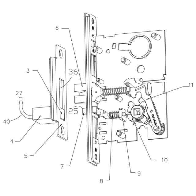 前記ロック舌機構は、前記ロック舌を有するロック舌本体と、前記本体に配置されたロック舌ばねとをさらに含み、前記ロック舌本体は、前記リンクストリップと接触し、前記ロック舌は、ドア枠ストライク板内に後退及び伸張することが可能であり、