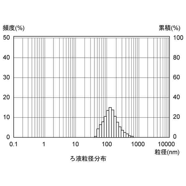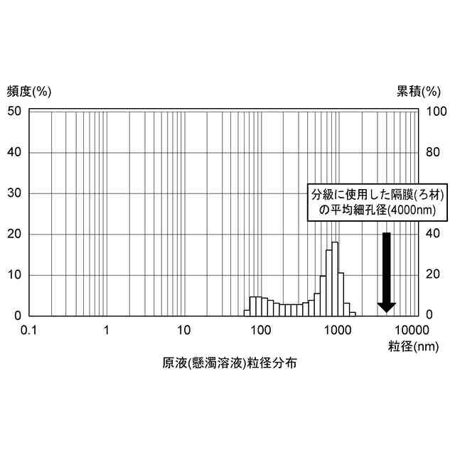 一般的な従来技術は、懸濁溶液スラリーから所定の粒径範囲の粒子群を分級するには、例えば、ろ材平均細孔径が200nmのろ材を用いてろ過分離し、ろ材平均細孔径を透過するか、透過しないかの物理的なろ過の分別を用いて粒子の大小のクラスに分離、つまり分級している。