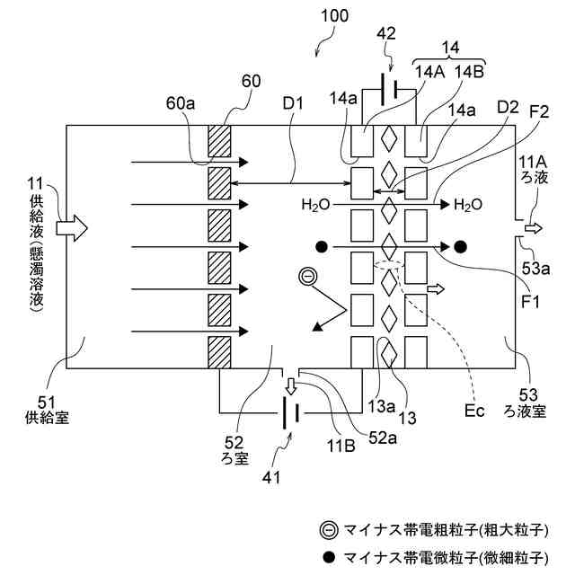 粒子が分散された懸濁溶液11を供給する供給51と、電界ろ過作用により溶液中の微粒子成分を透過し、粗粒子成分の濃縮液を保留するろ室52と、透過した微粒子成分を含むろ液として外部に排出するろ液室53と、を備え、ろ室52は、供給室側に配置された貫通穴を有する平板のアノード電極14と、ろ液室53側に配置され、マイナス帯電成分の粗粒子成分を阻止する細孔を有する隔膜13を備えると共に、細孔を有するカソードろ板電極14と、を備えてなる。
