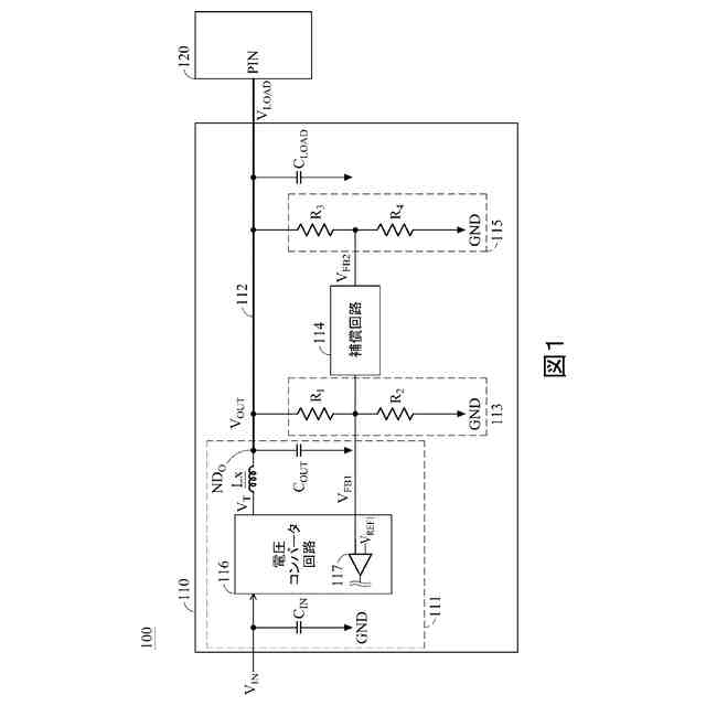 図1に示すように、電力供給システム100は、電源回路110およびシステムオンチップ(SOC)120を有する。電源回路110は、SOC120に電力を供給してSOC120を駆動する。本実施形態において、電源回路110は、発電回路111、導線112、フィードバック回路113および115、ならびに補償回路114を有する。発電回路111は、入力電圧V