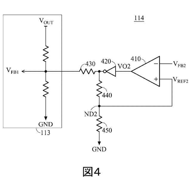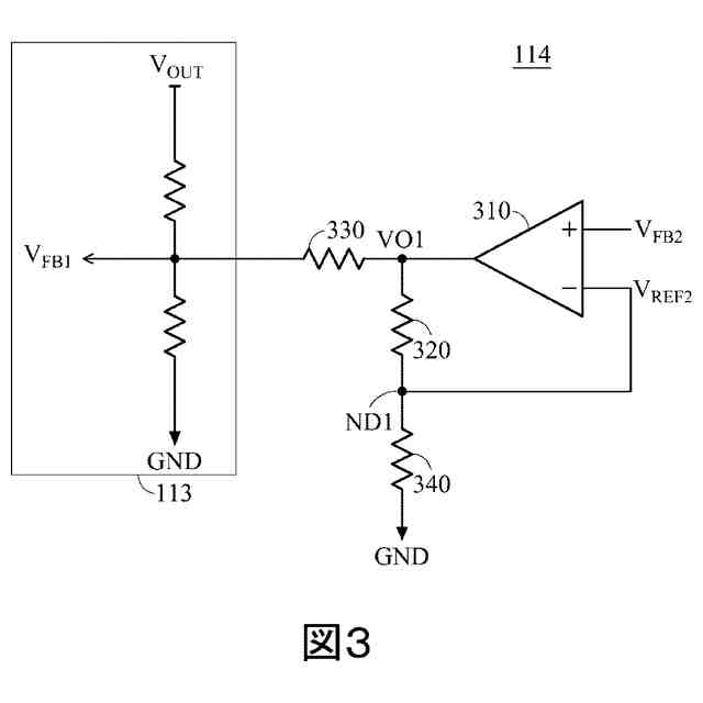 非反転入力端子、反転入力端子および出力端子を有し、前記非反転入力端子が前記第二フィードバック電圧を受けつけ、前記反転入力端子がノードに接続される演算増幅器と、