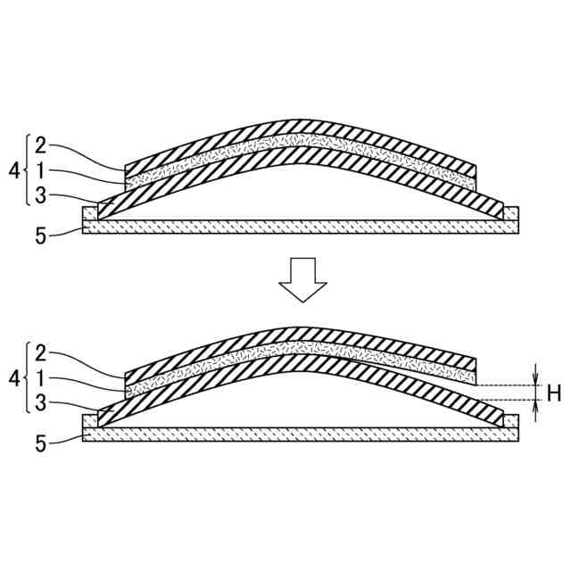 即ち、まず、粘着テープ1を幅25mm、長さ150mmの平面長方形状に裁断し、幅25mm、長さ150mm、厚み0.3mmのアルミニウム板2と、幅25mm、長さ200mm、厚み1mmのポリカーボネート樹脂板3とを粘着テープ1を用いて貼り合わせる。その際、粘着テープ1がポリカーボネート樹脂板3の長さ方向の中央部に位置するように調整する。ポリカーボネート樹脂板3上に300mm/分の速度で2kgのゴムローラーを一往復させて、ポリカーボネート樹脂板3とアルミニウム板2とを粘着テープ1を介して一体化させ、23℃で24時間に亘って静置し、積層体4を作製する。積層体4を図1に示すように冶具5に取り付け、積層体4の長さ方向に曲げ応力を加えることによって積層体4をそのポリカーボネート樹脂板3の長さ方向の両端間の距離が180mmとなるように円弧状に反った状態に変形させる。この状態にて積層体4を60℃、90%RHの恒温恒湿オーブンに入れて72時間に亘って静置させる。積層体4を円弧状に反った状態のままオーブンから取り出し、アルミニウム板2とポリカーボネート樹脂板3との間の浮き高さH(mm)をノギスで測定する。